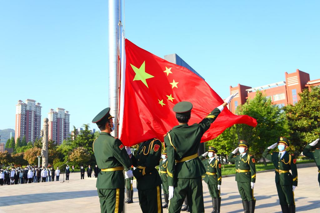 入团仪式前,升旗仪式举行。百名师生行注目礼,共唱国歌。