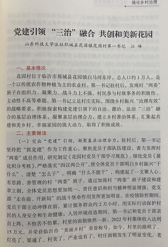 近期,由山东省驻村第一书记和工作队工作专班主持汇编的《省派第五轮第一书记工作案例选编》一书正式出版,我校省派第一书记江峰的工作案例《党建引领“三治”融合 共创和美新花园》入选。