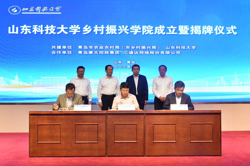 尹华在讲话中表示,实施乡村振兴战略,是以习近平同志为核心的党中央着眼党和国家事业全局发展作出的重大决策部署,高校作为人才培养和科技创新的策源地,我们深刻认识到高校服务乡村振兴战略的历史逻辑、价值逻辑、理论逻辑和实践逻辑,学校与青岛市农业农村局(市乡村振兴局)共建乡村振兴学院,并与青岛康大集团、汇通达网络股份有限公司开展合作,这既是贯彻落实党的二十大精神、服务国家重大战略的重要举措,又是落实习近平总书记关于“打造乡村振兴的齐鲁样板”重要指示精神的生动实践,期望发挥校政企各自特长,将乡村振兴学院打造成为乡村人才第一资源、乡村科技第一生产力与乡村创新发展第一动力的汇聚站。