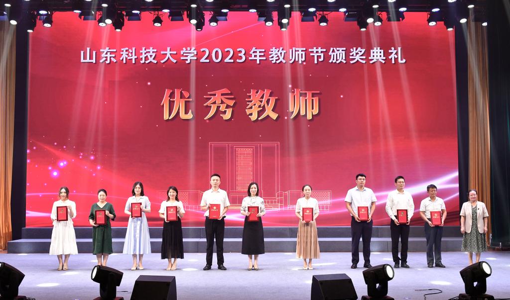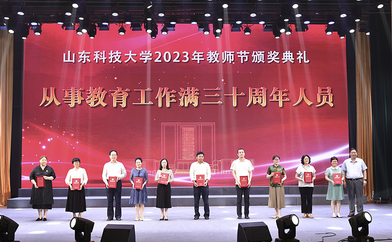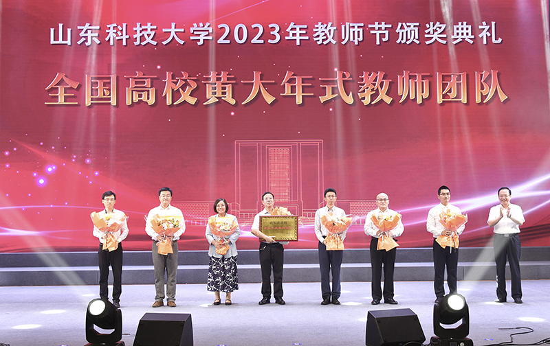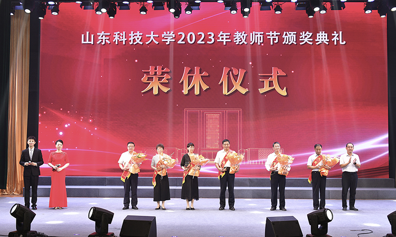 典礼上,校党委书记罗公利为入选第三批“全国高校黄大年式教师团队”创建示范活动入围名单的周东华教师团队颁奖。校长曾庆田为荣休教师代表赠送纪念奖杯,向荣休教师代表并通过他们向所有老教师送上节日的问候和祝福。获评2023年“齐鲁最美教师”的陈绍杰教授因工作原因未能到场,通过视频发来祝福。
