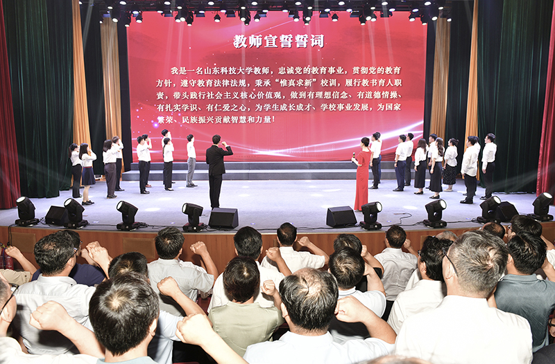 荣休教师代表吴强、李旭平将艺术学院退休教师王书侠教授书写的卷轴传递给新进教师代表,让“尚德尚学、严谨严格”的科大教风代代相传。在新进教师宣誓,老教师重温教师誓词环节,在主持人带领下,全场教师起立,齐颂教师誓词。
