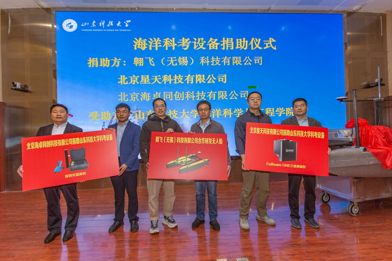 出征仪式上,翱飞(无锡)科技有限公司、北京星天科技有限公司、北京海卓同创科技有限公司向学校捐赠科考设备。与会领导共同为新一代极地无人船“嵙海7号”揭幕。现场还播放了极地无人船研制纪实视频,带领大家回顾了“嵙海”系列历代极地无人船的研发过程,介绍了新一代智能无人船的自主研制和试验情况。