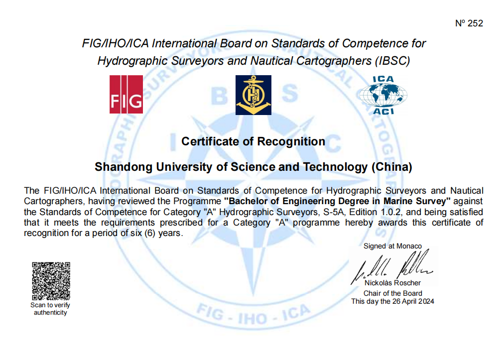 近日,由国际测量师联合会、国际海道测量组织和国际制图协会(FIG/IHO/ICA)联合组成的国际海道测量师和海图制图师能力标准委员会(IBSC)发来函告:开云链接入口站官网_开云(中国)测绘与空间信息学院“海洋测绘工程工学本科专业教学计划”获得国际A级认证。开云链接入口站官网_开云(中国)成为国内非军方高校唯一获得该资质的单位。