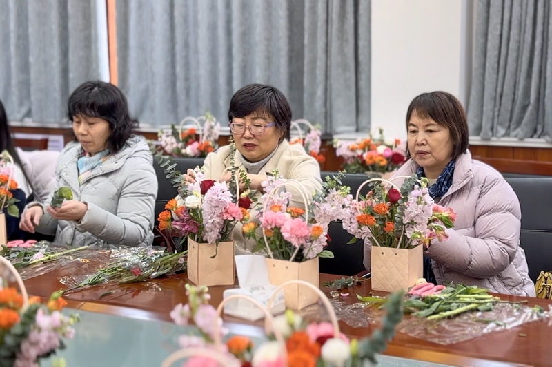 机电学院、材料学院、数学学院分别举办主题插花活动。在花艺师的指导下,女教职工学习体验了插花技艺,创作了一盆盆独具匠心、色彩斑斓的插花作品,不仅展现了女教师们对美的独特理解和追求,也蕴含着她们对生活的热爱和对未来的美好祝愿。活动现场花香四溢,笑语盈盈,洋溢着温馨浪漫的节日氛围。