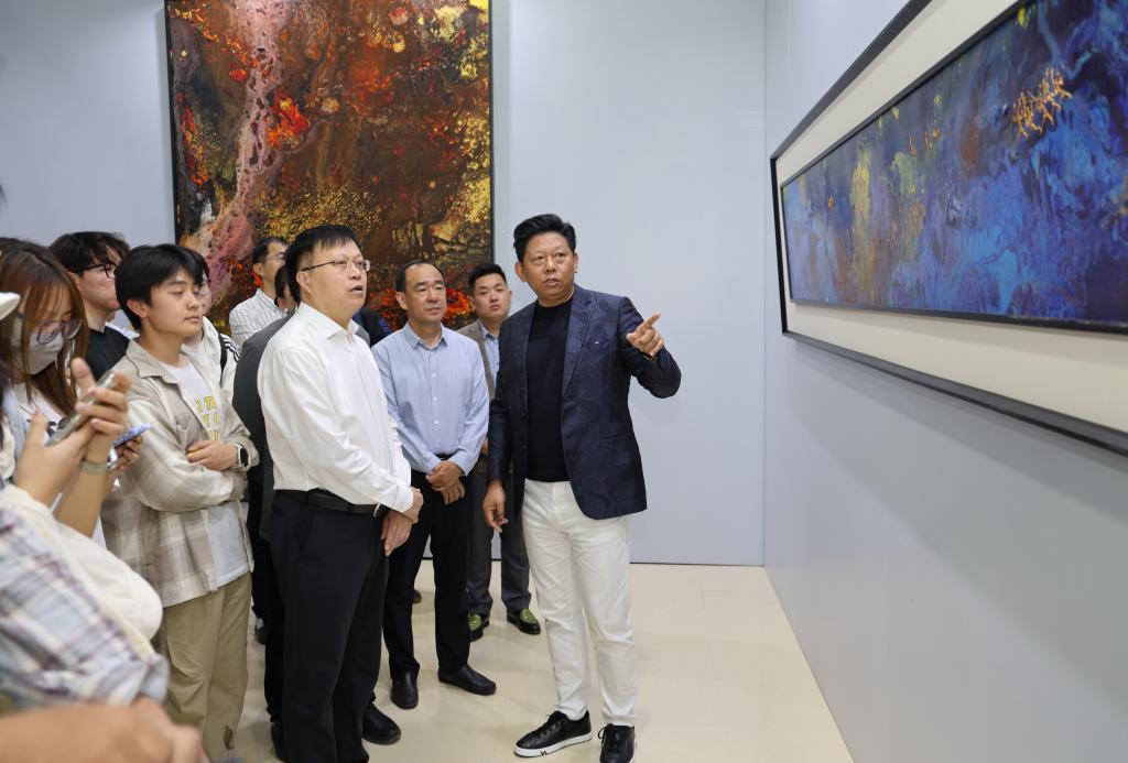 水鸟从容地在山水间飞过,科大师生熟悉的泰山仿佛直接被搬到展厅;静谧又热烈的蓝色、写意又生动的泼墨,带有强烈视觉冲击的色彩扑面而来,一眼让人踏入广袤的宇宙景观中……5月19日,“让世界看到中国的美”曹俊母校献礼展在开云链接入口站官网_开云(中国)图书馆开幕,我校采矿工程1985级校友、国际艺术家曹俊回访母校,带着他的部分精品力作举办展览。