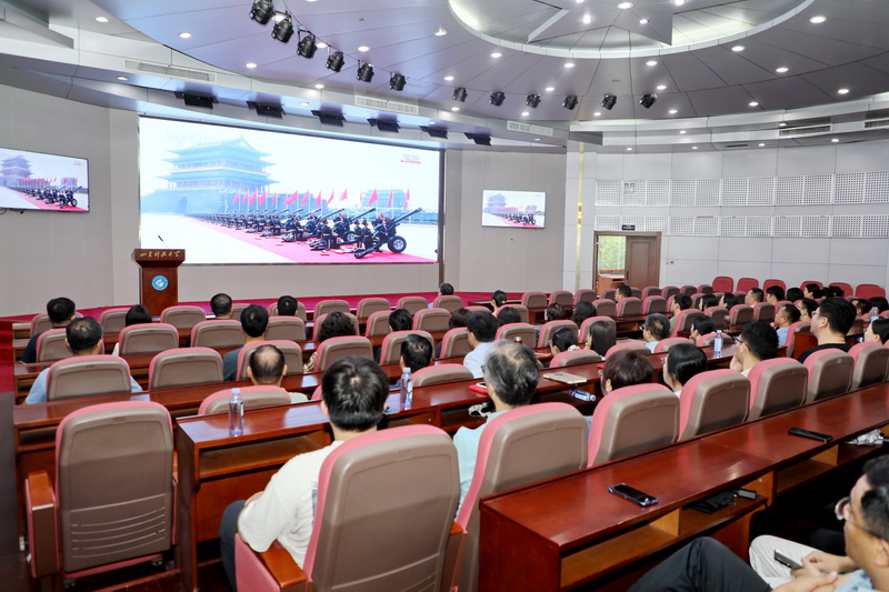 在会议室、教室、报告厅、实验室等集中观看现场,广大师生员工全神贯注聚焦屏幕,观看阅兵式直播画面。受阅部队铿锵有力的步伐、现代化武器装备的亮相,引来会场阵阵赞叹声。