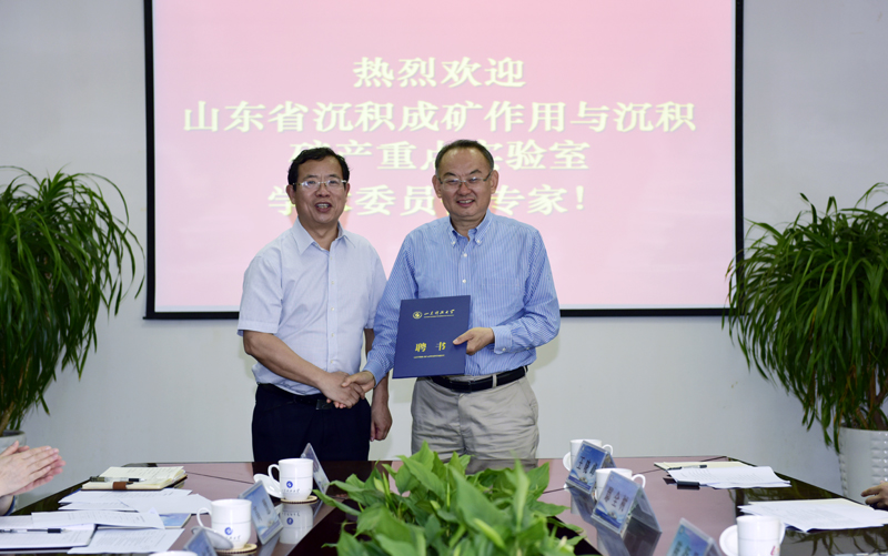 周东华在致辞中对与会专家的到来表示欢迎,对学术委员会专家长期以来给予实验室建设的支持和指导表示感谢,他简要介绍了学校省重点实验室的建设情况,期望专家就山东省沉积成矿作用与沉积矿产重点实验室未来发展与建设规划提出意见与建议,促进省重点实验室更好地实现良性发展。周东华并为实验室学术委员会委员颁发聘书。