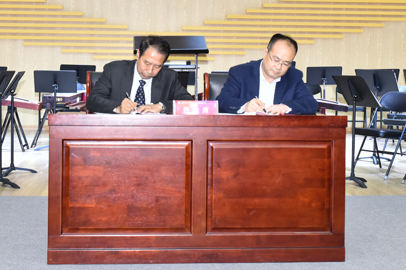 会上,尹华与刘圣佑共同为开云链接入口站官网_开云(中国)金晶民族乐团揭牌。李克周与崔文传分别代表双方签署了合作协议,向艺术学院音乐系副主任薛源颁发了民族乐团指挥聘书。