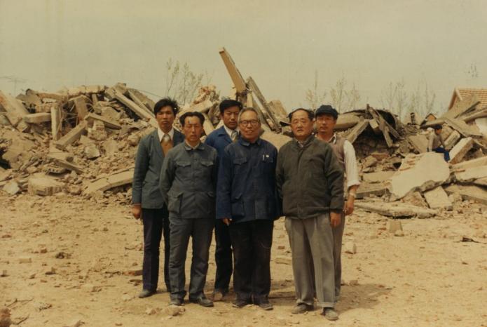 刘波(第一排右一)与同事在爆破所基建工地合影留念,摄于20世纪80年代