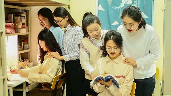 每晚基本都是11点,图书馆闭馆、教学楼关门,大家才结束学习,陆续回到宿舍。每到考试,宿舍里学习的氛围都格外浓厚,大家会带着一天中遇到的问题一起拿着小马扎到阁楼里讨论问题。曾祥婷在大一入学时,选择了其他学院的一个专业,源于对数学的热爱,大二上学期的她毅然选择了转入数学学院,面临转专业补课、专业差异、思维方式不同等问题,在舍友的帮助下,她很快就跟上了进度,并取得了不错的成绩。
