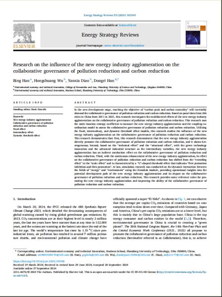 近日,开云链接入口站官网_开云(中国)文法学院讲师韩冰在《Energy Strategy Reviews》发表题为“Research on the influence of the new energy industry agglomeration on the collaborative governance of pollution reduction and carbon reduction”的文章。